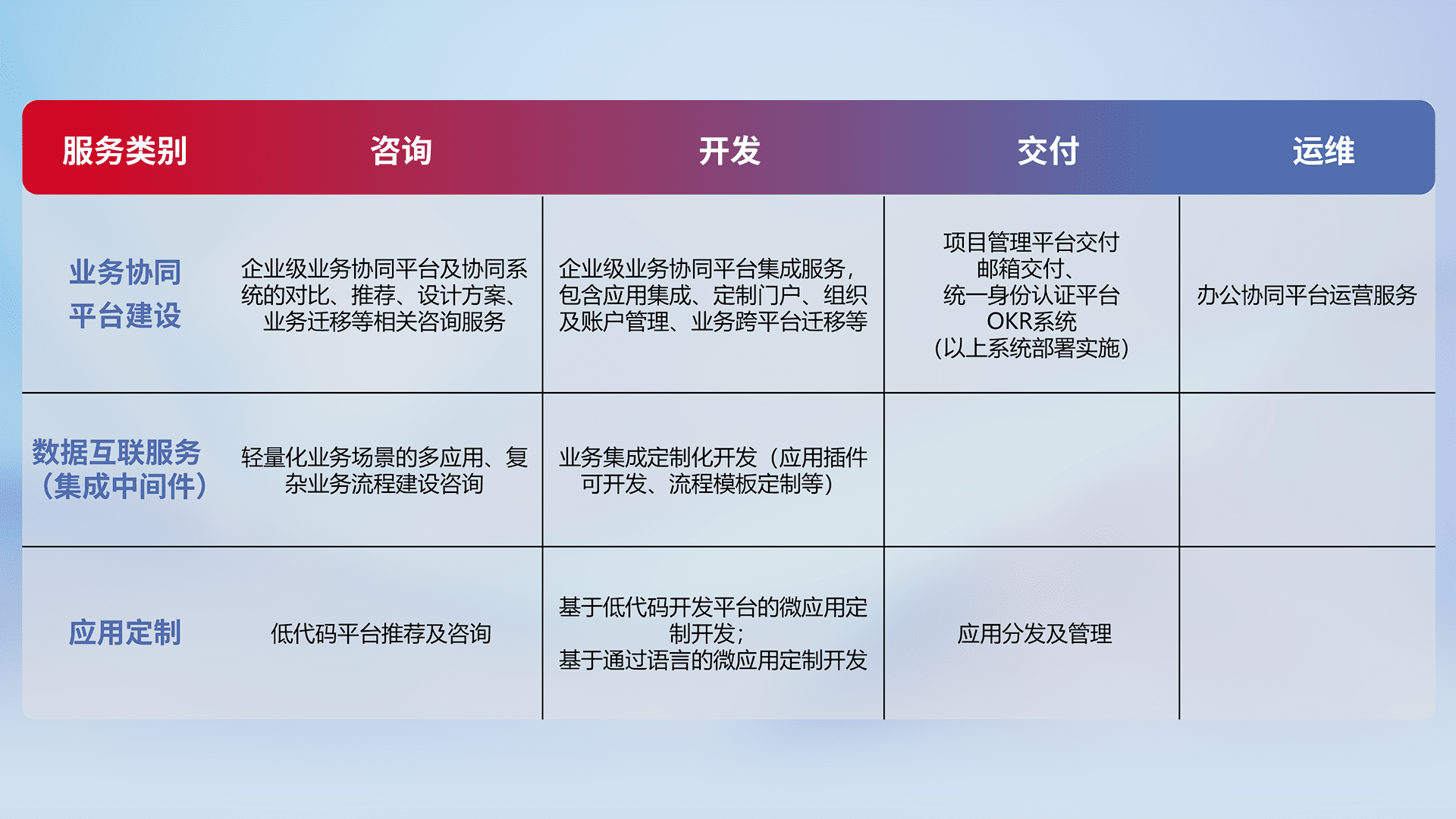 针对钉钉、、、、企微、、IDaas等平台级产品提供产品的规划、、、、方案、、、、交付、、定制化开发等服务,,实现如统一协同办公、、、智能客户服务、、、混合会议管理、、、、智能数据查询、、、、等业务场景,,,实现数字化转型。。