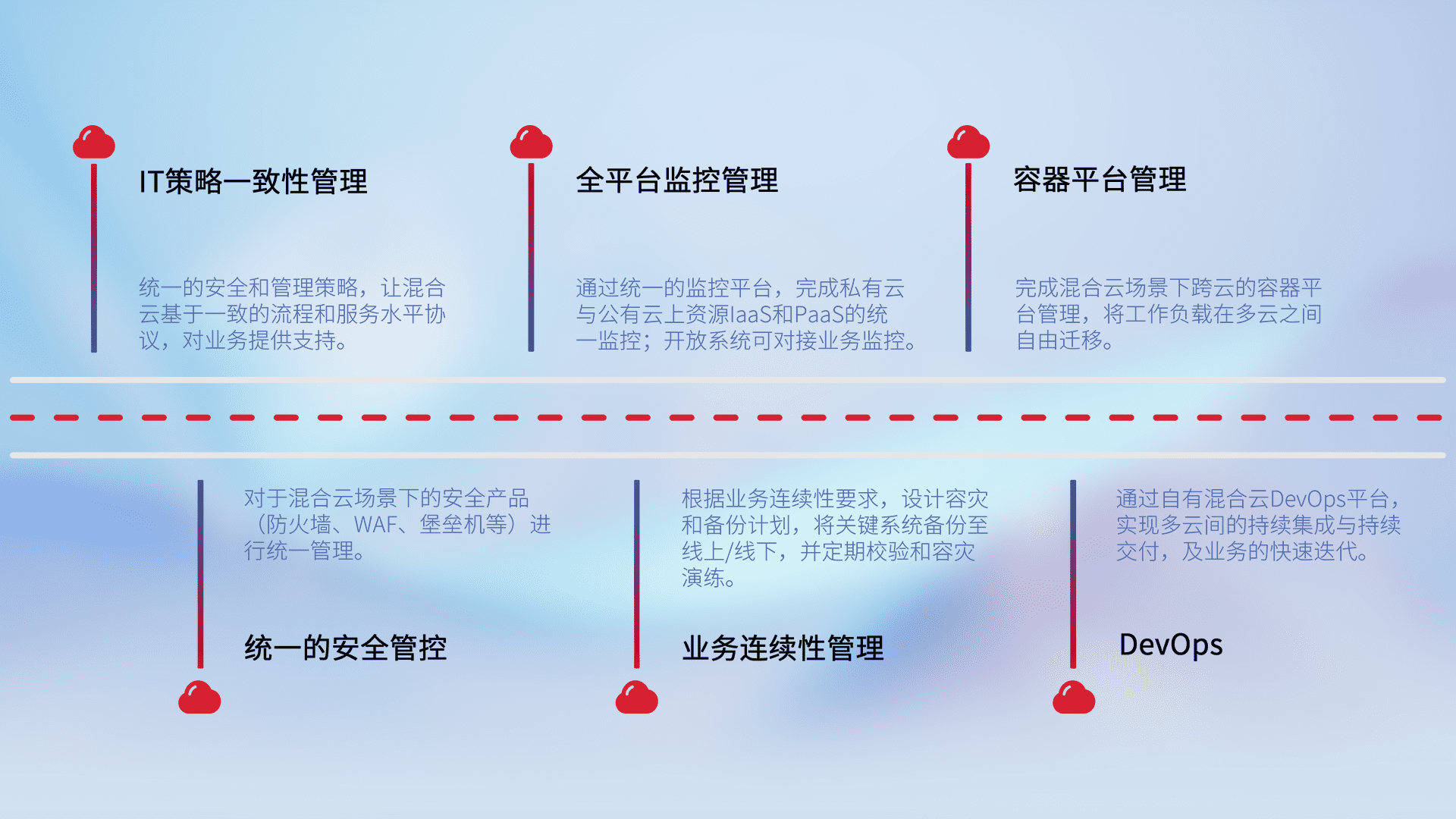 通过多云纳管,,以统一的资源数据模型把客户的云资源进行抽象和封装,,进而实现对多云资源的统一操作,,保障云资源管理的可靠性、、、稳定性与可用性。。量身定制化运维内容,,,,配置、、、、开发运维、、、、补丁管理、、、、备份、、、、监控、、、认证和访问管理、、审计和日常巡检等,,保障在用云过程中的可靠度,,稳定度以及高可用率。。。