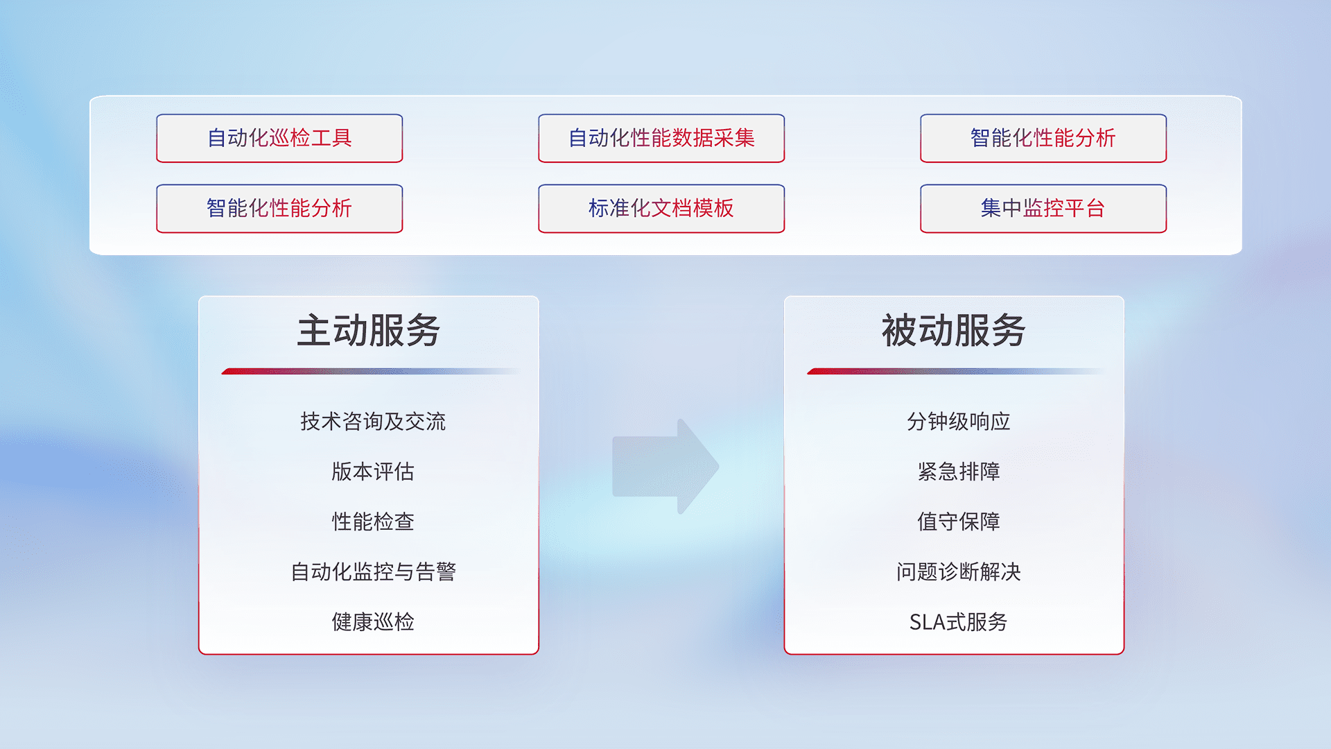 智能化工具和标准化文档,,,,保障服务质量,,提供主动服务(包含技术咨询、、、、版本评估、、性能检查、、、自动化监控与告警、、、、健康巡检)和被动服务包含(分钟级响应、、、紧急排障、、、、值守保障、、、、问题诊断解决、、、SLA服务)。。。。