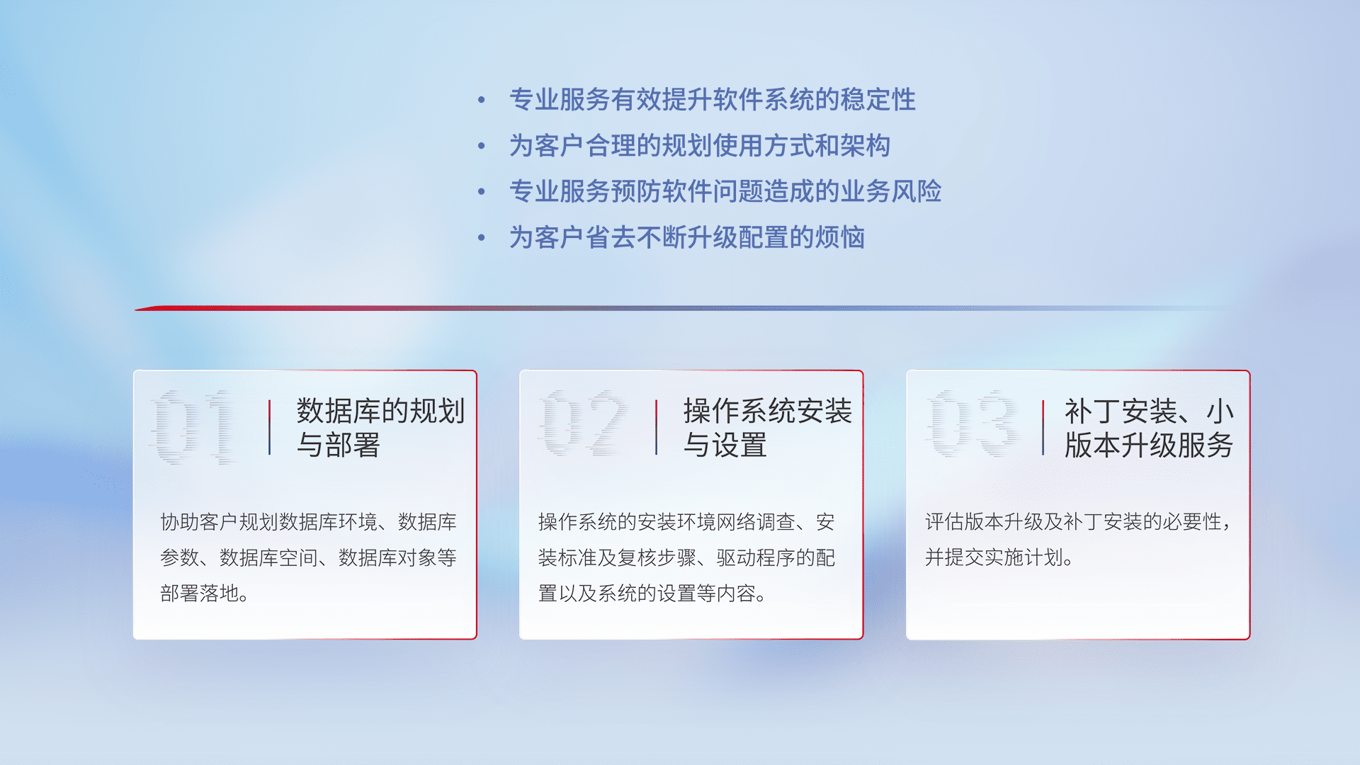 为客户提供软件规模升级、、、快速部署、、、、按需配置的专业服务,,,从数据库的规划与部署到操作系统的安装与设置,,,,再到补丁安装和小版本升级提供支持。。。